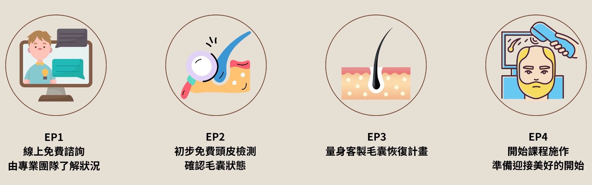 我們會先免費的頭皮諮詢,看看區塊大小,再由育髮師向您介紹,第一次的諮詢和操作時間大約需要1.5-2小時。